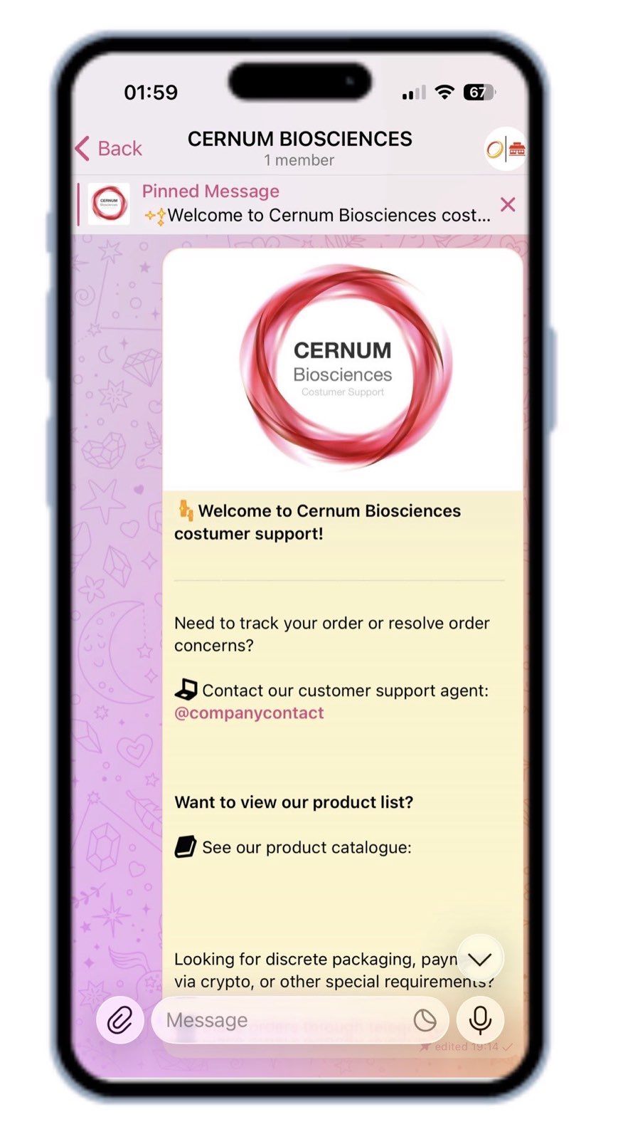 Cernum Biotechnologies will never spam your email with marketing and promotions. Instead Cernum Biotechnologies uses Telegram as a newsletter. Through our Telegram Costumer Support & Newsletter system, customers can choose what notifications they would like to receive, such as when their selected product restocks, when their selected collection goes on sale, when their desired product is released, and much more.